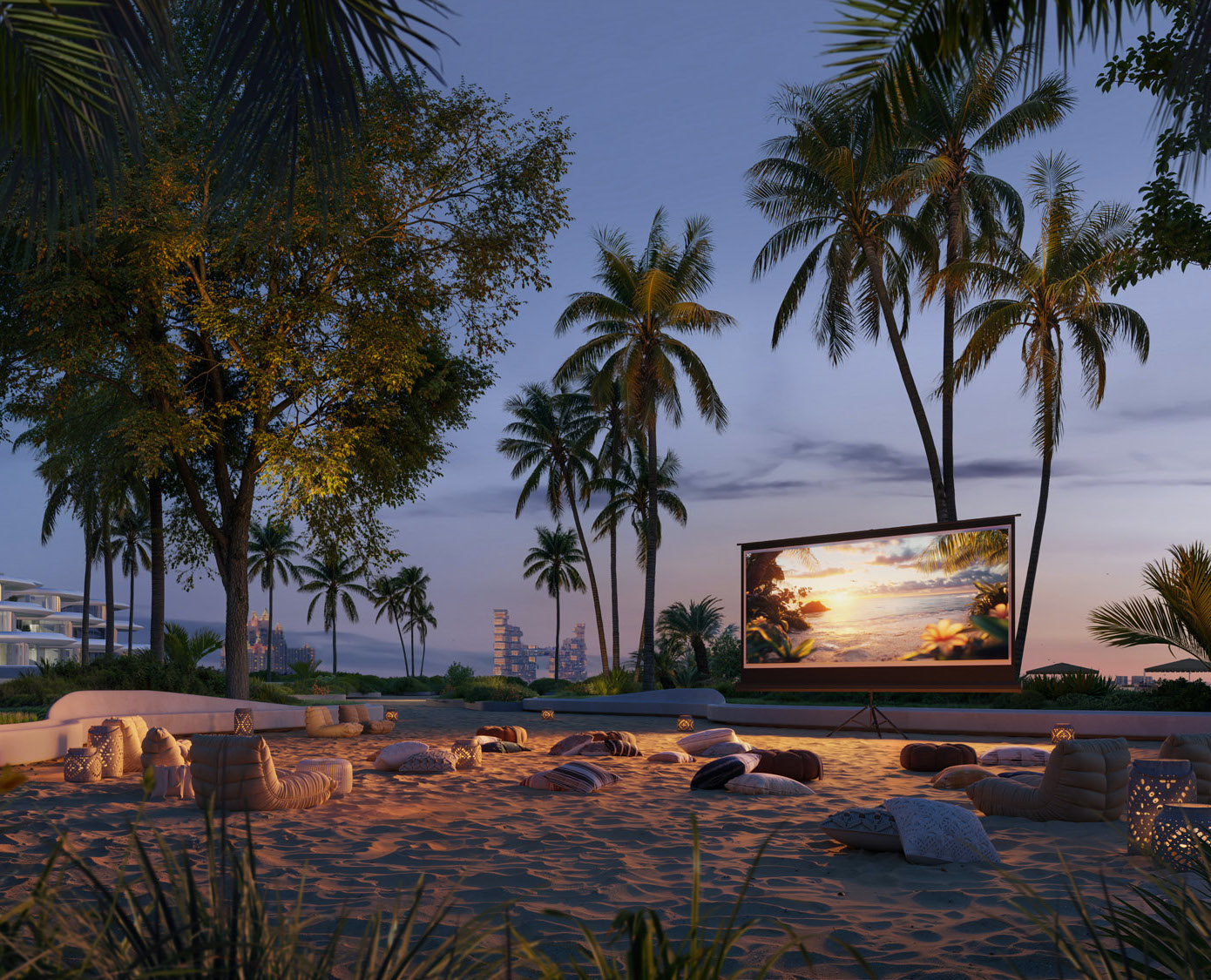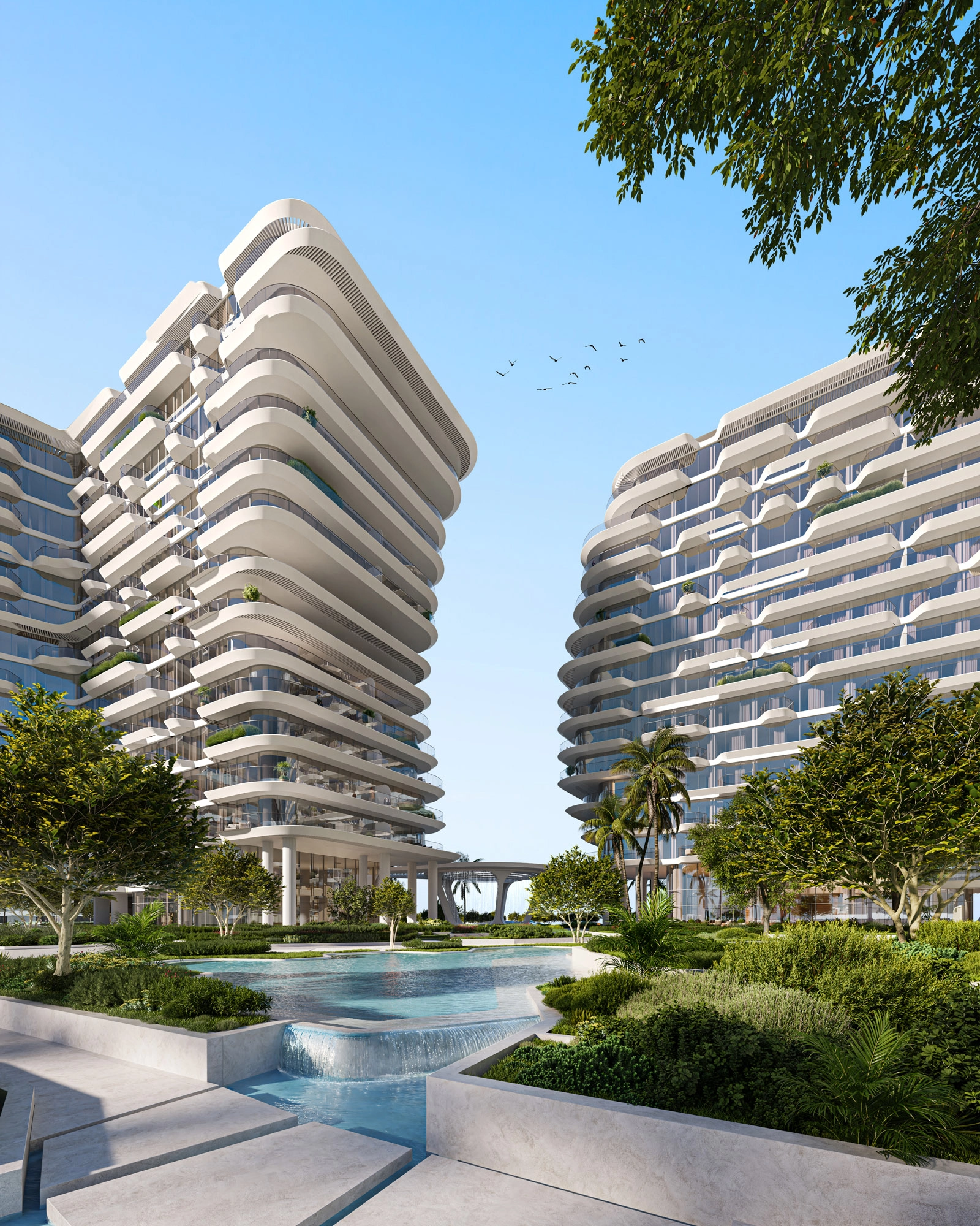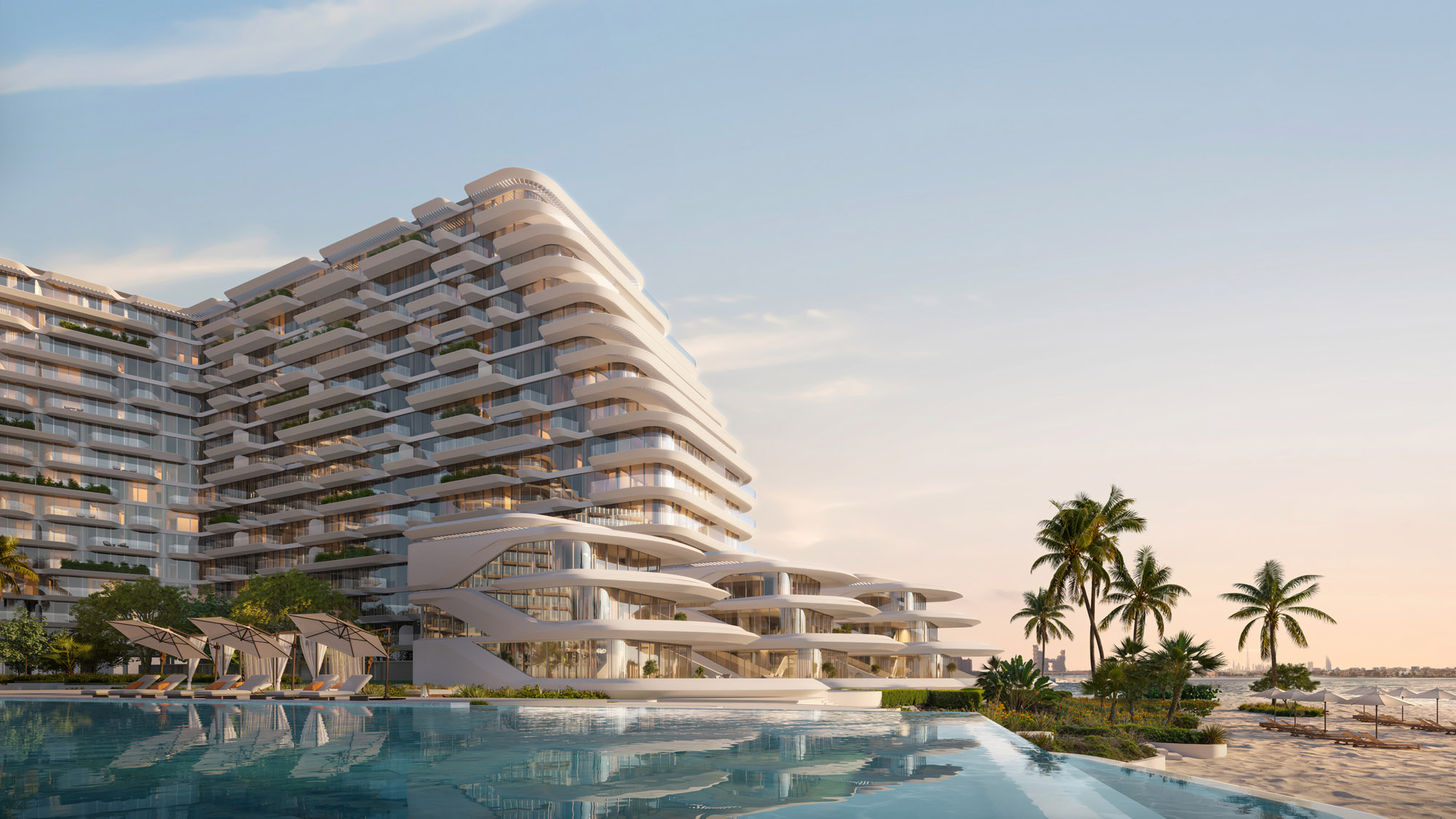 Resort‑style living with private beach, infinity sky pools, wellness pavilion, yoga and spa, kids’ and social lounges, and panoramic sea and skyline views.