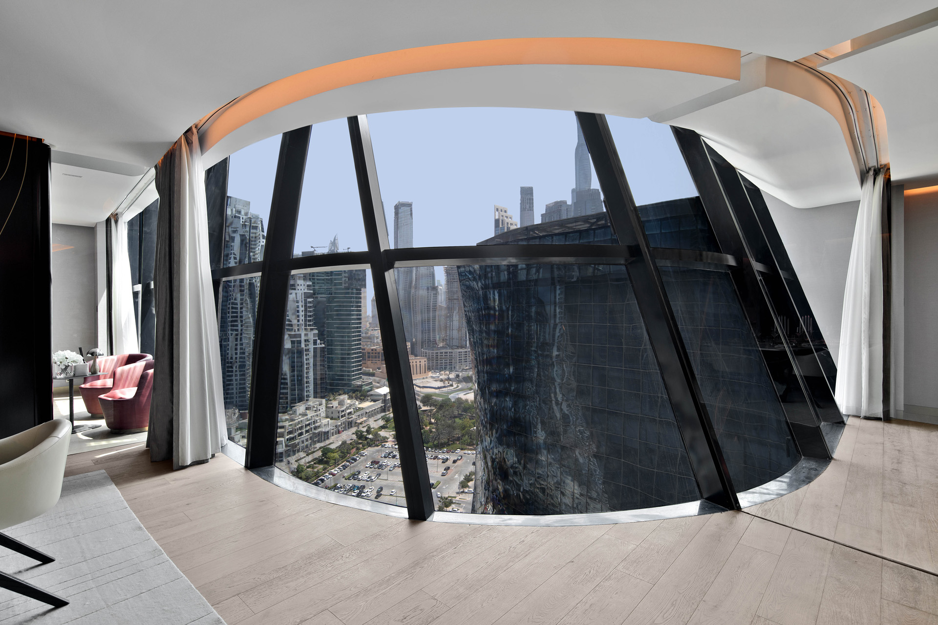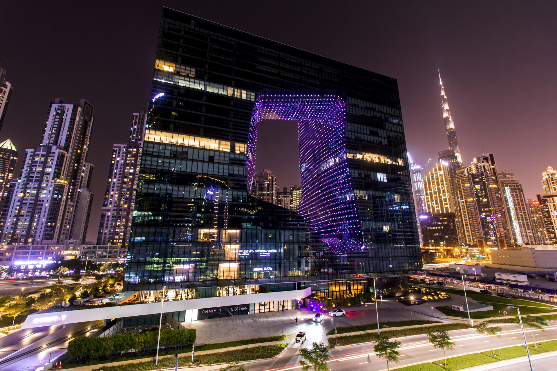 By day, the reflective façade mirrors Dubai’s sky; by night, a dynamic LED light matrix transforms the structure into a luminous urban artwork. The dramatic central void—flowing and poetic—defines the building’s identity and exemplifies Hadid’s vision of harmony between form and nature.
