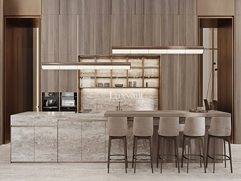 The residence features a thoughtfully designed dual-kitchen layout, including a sophisticated show kitchen with premium built-in appliances and a stylish breakfast bar, alongside a fully equipped back kitchen for added functionality. A dedicated maids’ room further elevates everyday convenience.