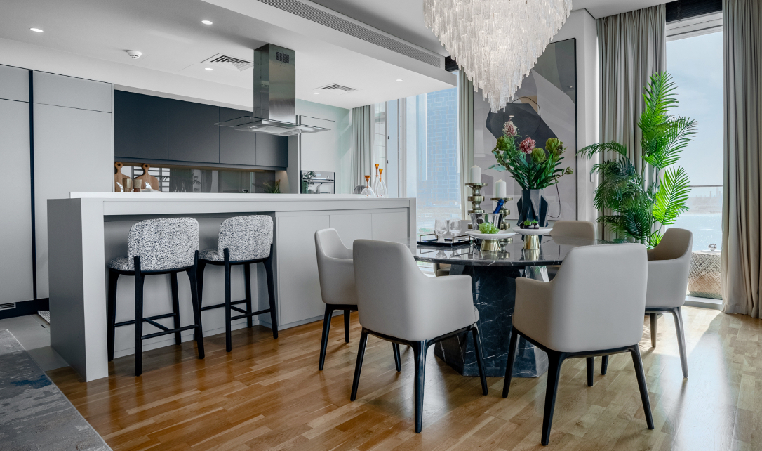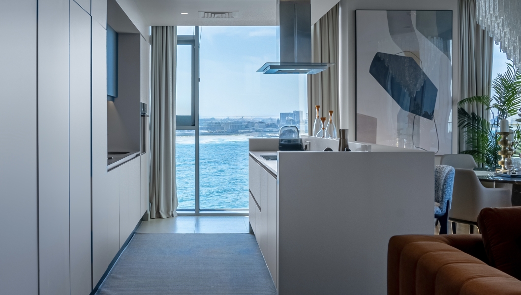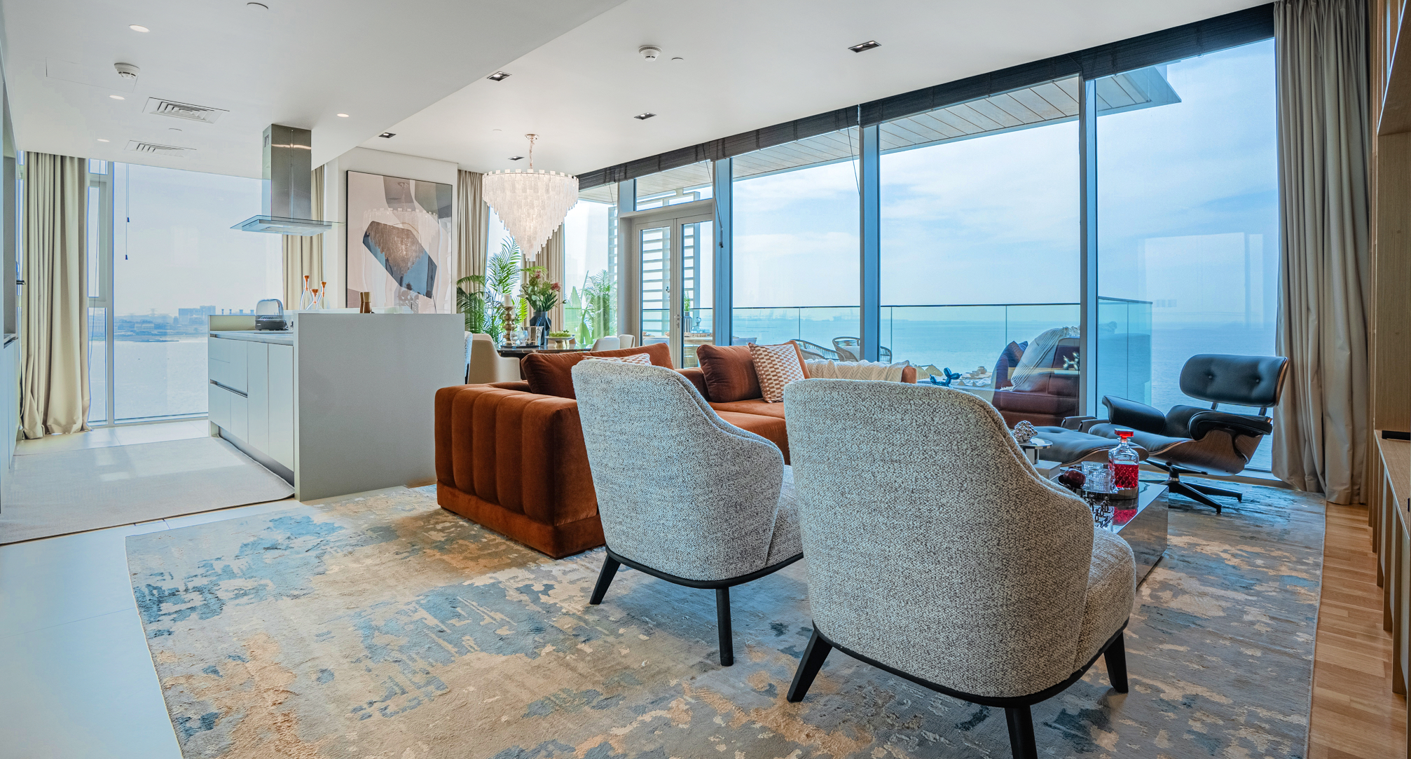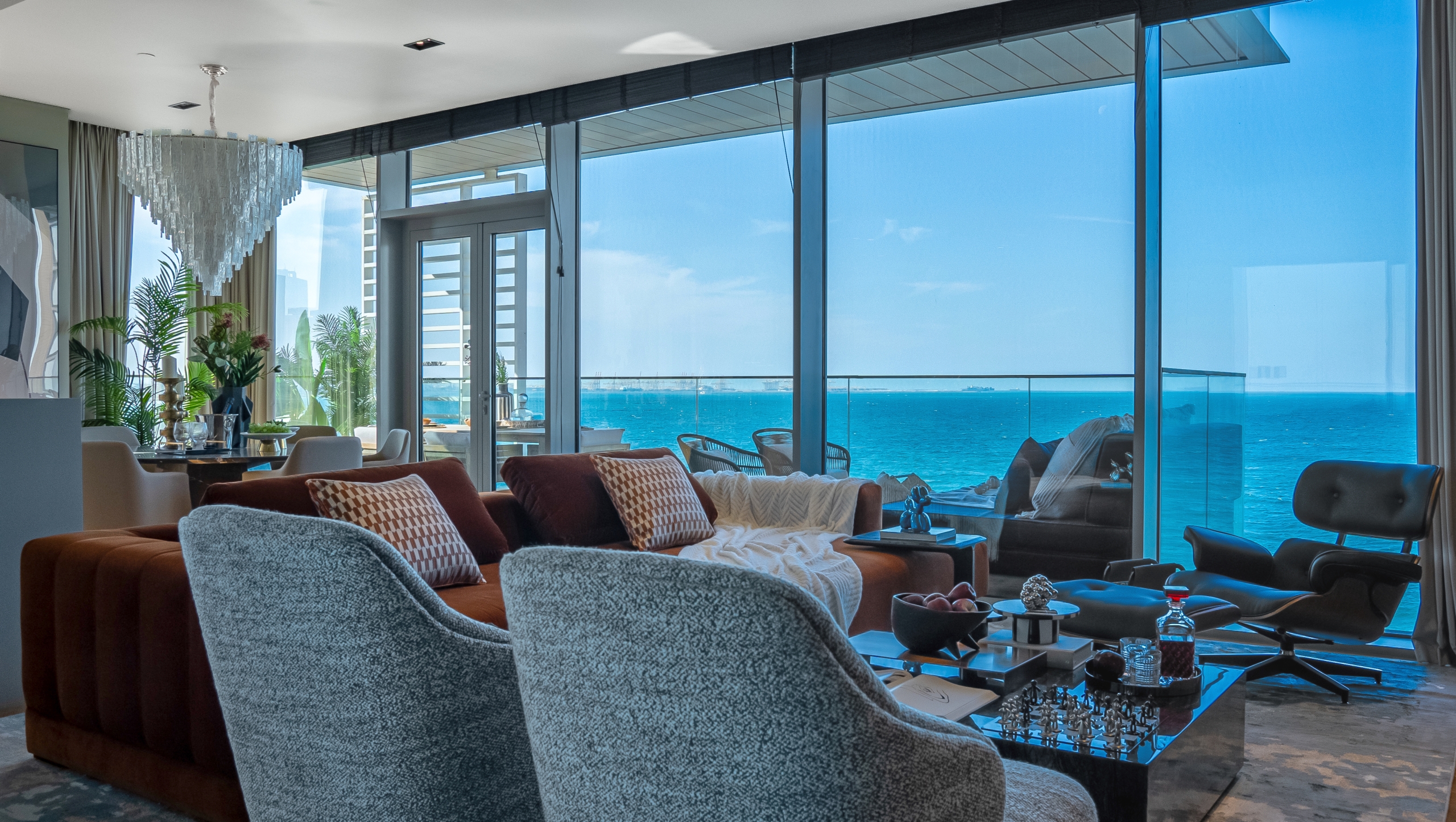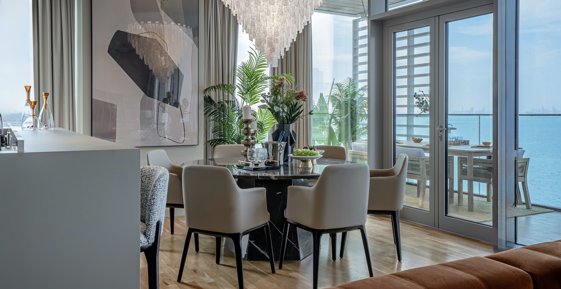 The open-plan living and dining area is surrounded by floor-to-ceiling windows that frame stunning views of the Arabian Gulf and fill the space with natural light. A generously sized private terrace offers the perfect place to unwind, entertain, or simply enjoy the uninterrupted sea views in total privacy.