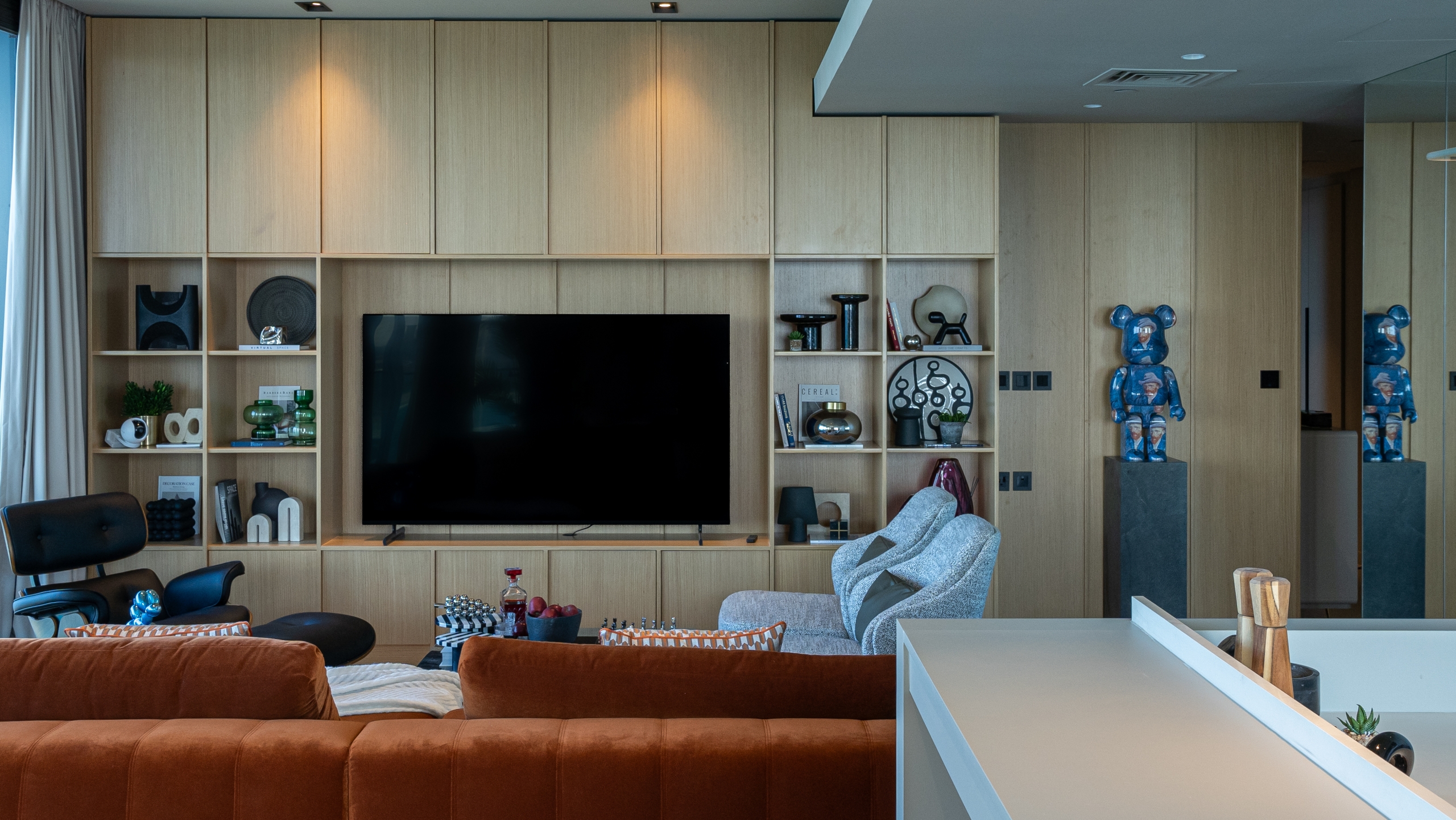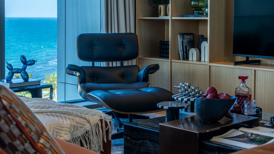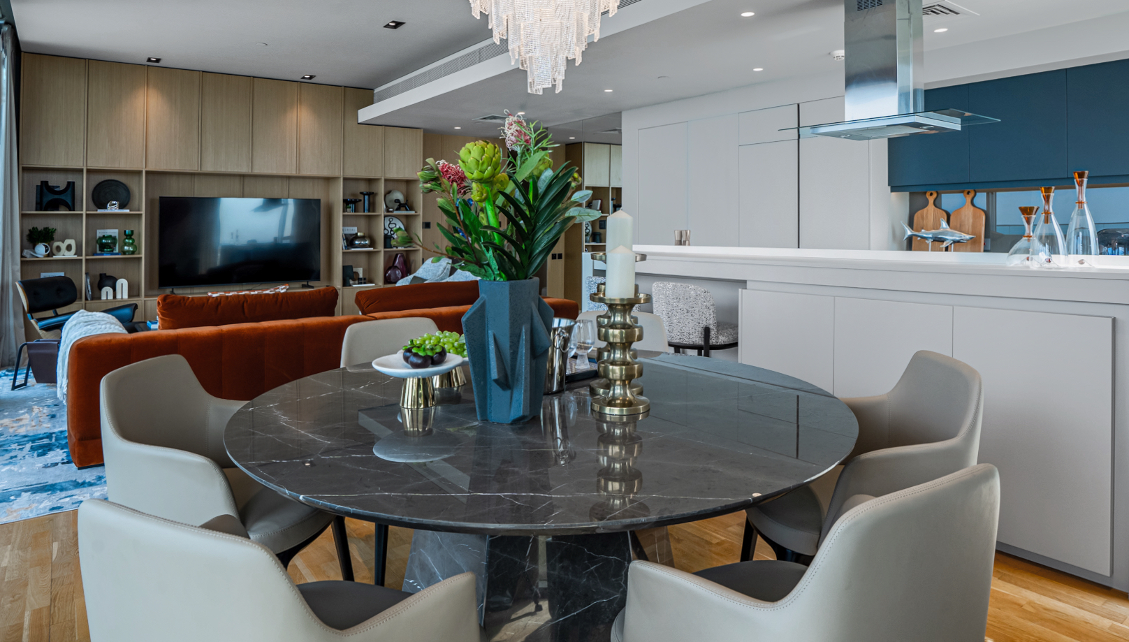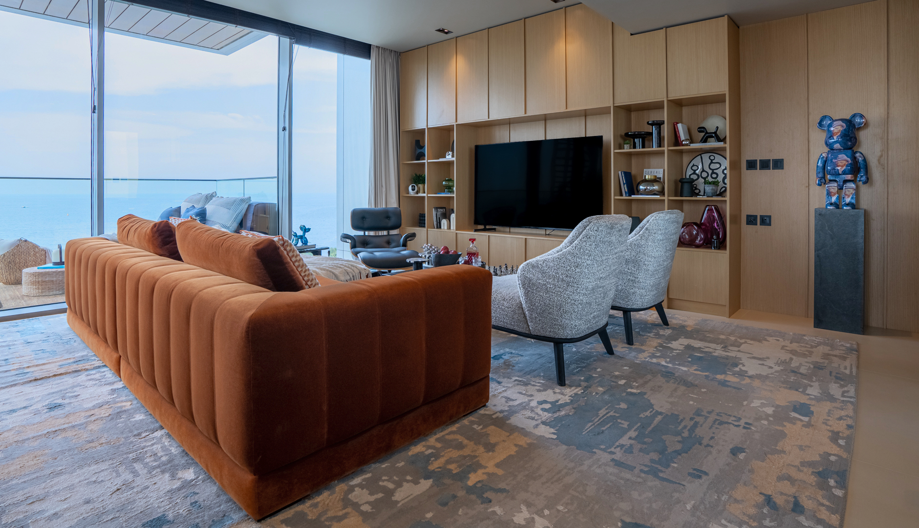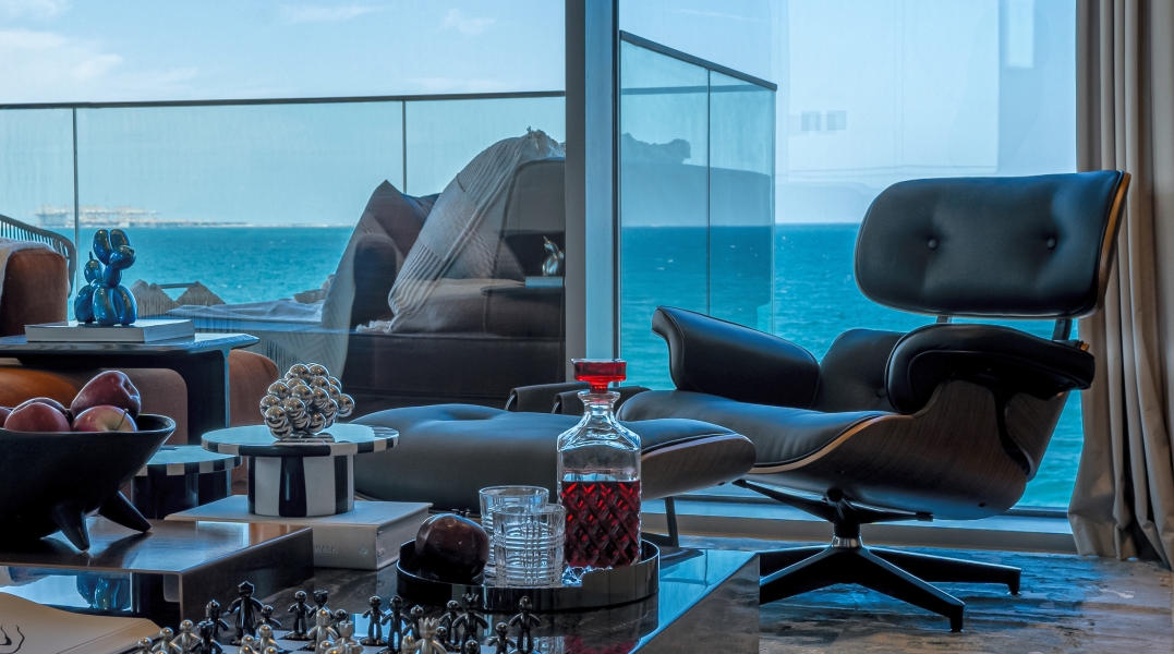 The open-plan living and dining area is surrounded by floor-to-ceiling windows that frame stunning views of the Arabian Gulf and fill the space with natural light. A generously sized private terrace offers the perfect place to unwind, entertain, or simply enjoy the uninterrupted sea views in total privacy.