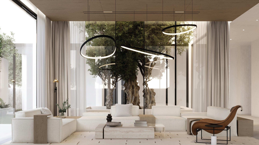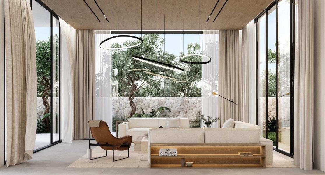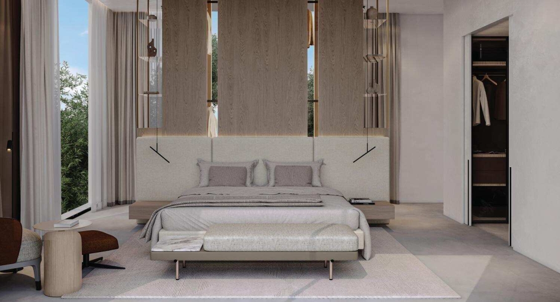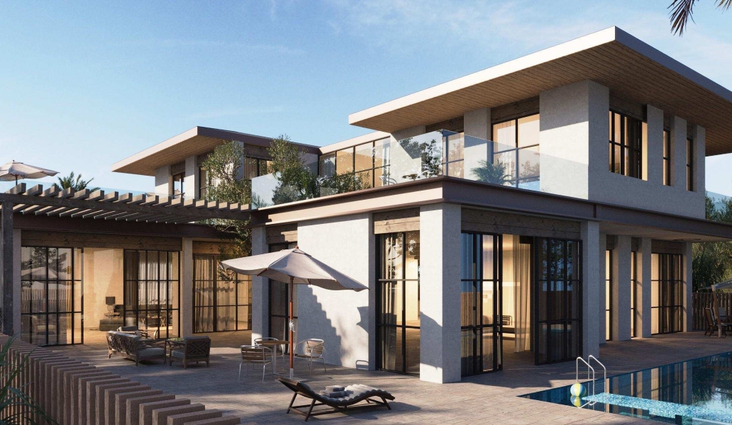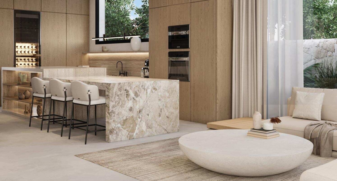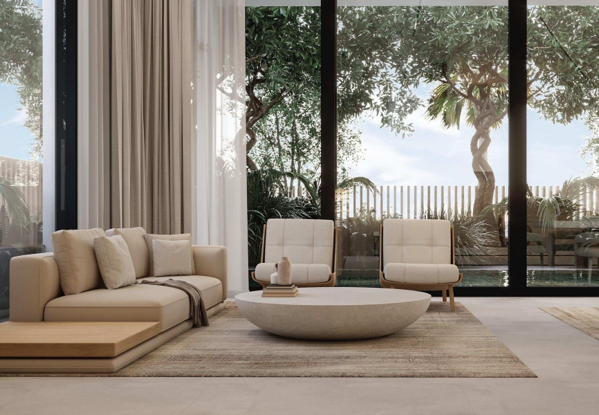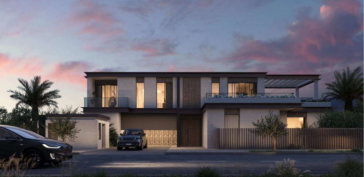 Featuring a beautiful Contemporary or Californian-inspired façade, the villa welcomes you with wide terraces and thoughtfully designed interiors. Inside, the home offers spacious living areas including a family lounge and majlis, enhanced by warm earthy tones, natural timber elements, and premium porcelain finishes—creating a cozy and inviting atmosphere. Floor-to-ceiling windows fill the home with natural light, offering a bright and airy feel throughout.
